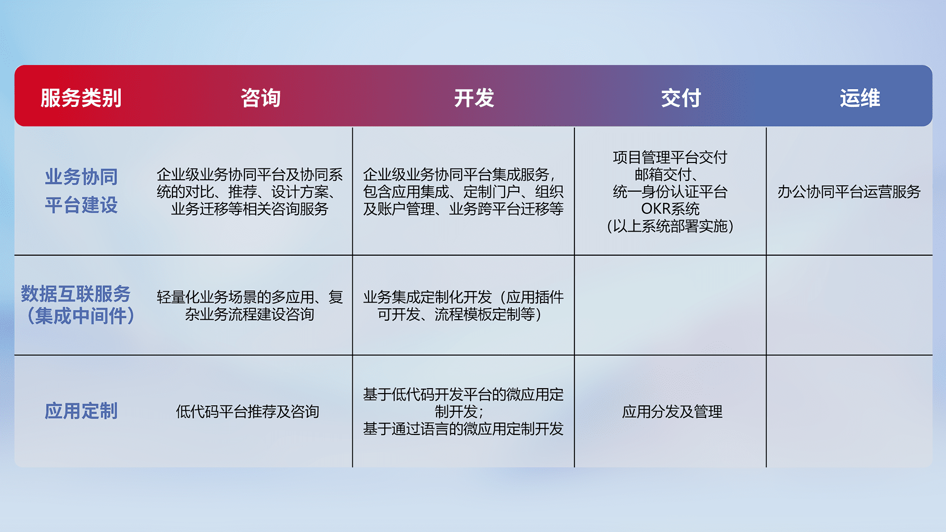 针对钉钉、、、企微、、、、IDaas等平台级产品提供产品的规划、、、、方案、、、、交付、、定制化开发等服务,,,实现如统一协同办公、、智能客户服务、、混合会议管理、、智能数据查询、、、等业务场景,,实现数字化转型。。